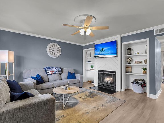 Cozy fireplacePrivate patioPrivate balconyUpdated kitchenBuilt-in shelvingNew countertopsBlack appliances
