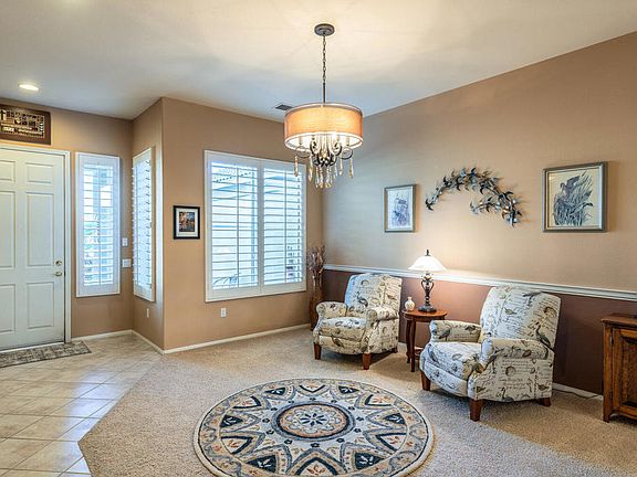 Welcome to Heritage Palms Country Club and this beautiful 2,172 sq. ft. Hoylake Plan home. From the moment you enter, you're greeted by an open, light-filled layout featuring a spacious living area and formal dining room accented by elegant chandeliers and a cozy double-sided fireplace. Just off the kitchen, the inviting great room provides the perfect space to relax or watch your favorite game while enjoying the warmth of the shared fireplace. The chef's kitchen features a decorative tile backsplash, hickory cabinetry, a center island, double wall ovens, a walk-in pantry, and a wine cabinet--ideal for both everyday living and effortless entertaining.This highly desirable floor plan includes two generous primary suites, each designed for comfort and privacy. Both feature ensuite baths with a walk-in shower or tub-shower combination, new porcelain tile flooring, and custom walk-in closets with built-ins and coffered ceilings. A convenient half bath is located off the great room for guests. Step outside to a beautifully landscaped, south-facing backyard with an extended covered patio, complete with landscape lighting for evening enjoyment. Accessible from both the great room and primary suite, this inviting outdoor space is perfect for peaceful mornings or gatherings under the desert sky. Additional highlights include an extended deep garage with built-in cabinetry and golf cart space, insulated garage doors, ceiling fans, plantation shutters, silhouette window coverings, three bay windows, skylights, newer bedroom carpeting, a spacious laundry room with garage access, upgraded sliding doors with phantom screens, and a newer dual-zone A/C system. Meticulously maintained and thoughtfully upgraded, this exceptional home offers the perfect blend of comfort, elegance, and functionality. This home is offered fully furnished and ready for move-in! Heritage Palms Country Club is a premier 55+ community, showcasing an 18-hole championship golf course, fitness center, indoor and outdoor pools, plus a lively tennis and pickleball program. Don't miss the chance to experience resort-style living at its best!