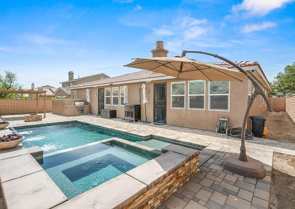 Desert Luxury with Modern Flair!Step into this beautifully upgraded 4-bedroom, 3-bathroom home boasting 3,005 sq ft of open and functional living space. From the formal living room to the expansive great room, every corner of this home is designed with style and comfort in mind. Tile flooring flows throughout, offering a sleek and low-maintenance foundation for everyday living.The heart of the home features a chef-inspired kitchen overlooking the great room and built-in bar--ideal for entertaining. A cozy fireplace warms the space on those chilly desert nights, while a custom built-in desk in the hallway provides the perfect work-from-home setup. Gorgeous crown molding & surround sound are just some of the many features this beauty provides.Retreat to the custom-designed primary suite, complete with two walk-in closets and a spa-like bathroom showcasing a modern soaking tub, oversized walk-in shower, and dual vanities.Step outside to your private oasis: a sparkling pool and spa with custom cascading waterfalls, LED lighting, a built-in barbecue, cozy stone fire pit, and stunning paver patio--an entertainer's dream come true. A spacious 3-car garage completes the package.This home blends modern luxury with desert charm--schedule your private showing today!