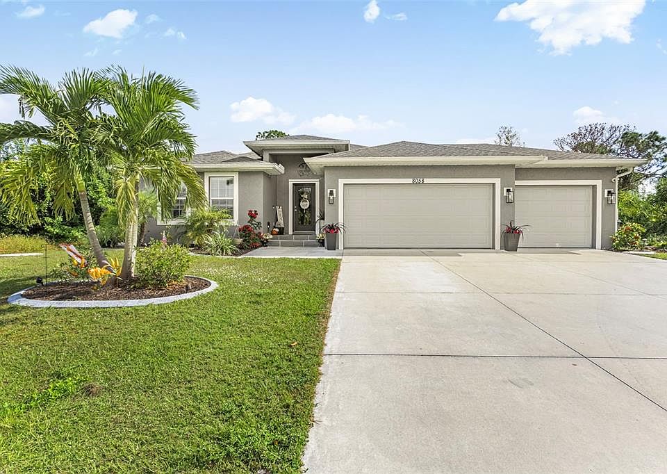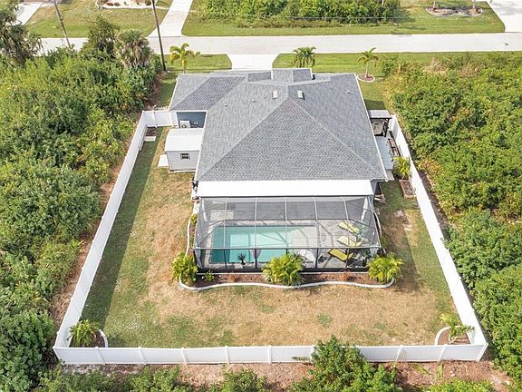Experience Florida living at its finest in this beautifully maintained 3-bedroom, 2-bath home with an oversized 3-car garage. The spacious open-concept design features tile flooring throughout, cathedral and tray ceilings, granite countertops, and recessed lighting that create a bright and elegant atmosphere. The kitchen is equipped with stainless steel appliances, a large island, a walk-in pantry, and a living room area that opens to the lanai through sliding glass doors, making indoor-outdoor living seamless. Outside, enjoy your private backyard retreat complete with a heated SALT WATER pool, extended lanai with LED lighting, and a mounted TV that stays with the home. A custom 10x24 side deck perfect for your grill that enhances the outdoor entertainment space. The yard is fully enclosed with a vinyl privacy fence and gate, beautifully landscaped with concrete curbing, low-voltage lighting in the front and back, and a 10x10 storage shed. The garage has been upgraded with epoxy flooring, insulated and equipped with a mini-split A/C, and insulation, offering the potential for flexible use. Additional highlights include a WHOLE-HOUSE REVERSE ORMOSIS SYSTEM, pre-wiring for a 13,000-watt generator (included in the sale), and hurricane/storm shutters for added protection. Situated in South Gulf Cove community with convenient access to shopping, dining, and boating, this home was thoughtfully designed for comfort, efficiency, and the Florida lifestyle.