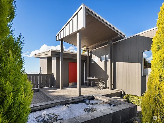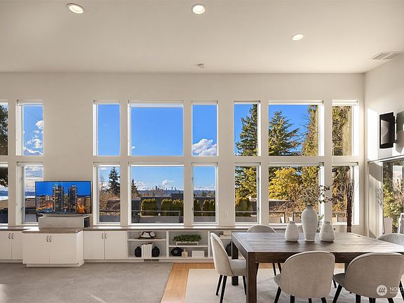 This artful contemporary on a quiet Medina Heights lane is a jewel. Panoramic western windows showcase lake, city and Mountain views. The open floor plan is light, bright and easy to entertain in with built-ins throughout and an open kitchen & great room to welcome your favorite crowd. This private oasis with soaring ceilings on the main level is a Northwest haven for enjoying the symphony of daily sunset colors. The main floor bedroom/office and primary suite with two closets allows for all of life's stages. The lower level hosts a great flex room, fun media room and two bedrooms. Enjoy the outdoor water feature, level play yard and big wrap around deck. A quick stroll to Medina Elementary and Medina Park. Outstanding Lifestyle and value!