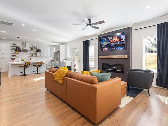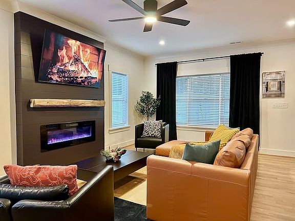 Cozy living room featuring an electric fireplace, 65" Smart TVs (in the living room and primary bedroom), and a large sectional sofa.