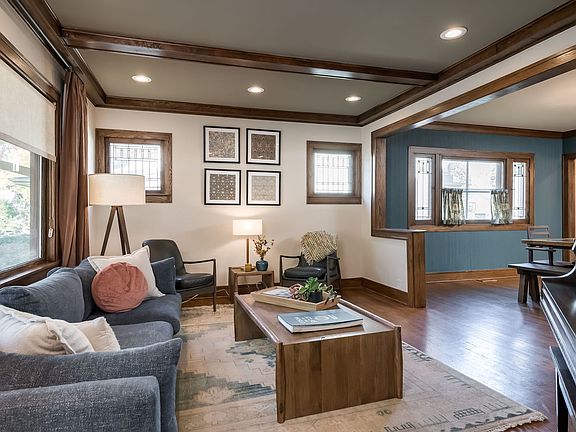 Impressive & inviting is this sprawling turnkey 5 BR/ 4BA Arts & Crafts gem. Rich, natural woodwork beckons from the moment you step inside this Prairie-Style treasure. Noteworthy are 3 finished levels of living coupled with a generous footprint. Flexible living space includes a full bath on each floor (in addition to a primary suite) and two 1st floor bedrooms. A circular floor plan makes for comfortable living and entertaining. Efficient kitchen has newer appliances and seating for 5 at peninsula. Well-designed family room comes with wood-burning fireplace and clever built-in cabinetry plus window-seat storage. The 2nd floor has three generous bedrooms (including primary), a full hall bath with dual sinks and convenient laundry room. Primary suite has private balcony, custom built-in cabinetry, and two walk-in closets. Basement was transformed and reconfigured in 2024 with a generous rec room, wet bar (wine fridge included), home office/ guest room, new full bathroom and an in-home sauna. Interior drain tile and sump pump installed. Two-car garage has an attached nicely finished space and perfect for a home office or other use. A mini split keeps it warm & cool, as needed. Great opportunity to move into a fabulous neighborhood. Less than 1 block from Mann Elementary (K-5). So many places to explore and enjoy in and surrounding Oak Park! Close proximity to Costco, Target, Trader Joe's, Jewel and so much more!