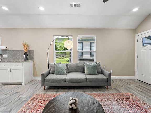 This recently built 3-bedroom, 2-bathroom duplex offers 1,255 sq ft of stylish living space in a convenient location. The open-concept floor plan features high vaulted ceilings, wood-like ceramic tile flooring throughout, and plush carpeting in the bedrooms. The kitchen boasts granite countertops, stainless steel appliances, and ample cabinet space. The primary suite includes a walk-in closet and a private bath. Additional amenities include a fenced backyard, one-car garage, and central heating and cooling.