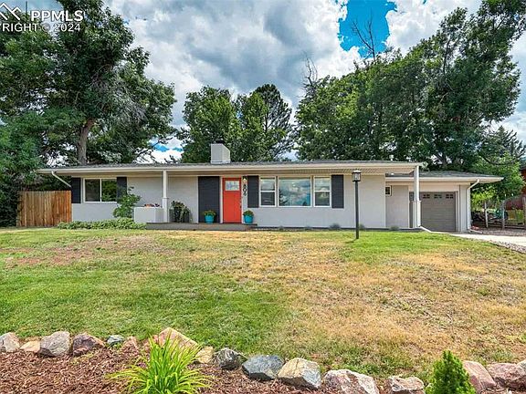 This wonderful stucco ranch home, totally remodeled in 2021, welcomes visitors with its vibrant orange front door and great covered front porch area with plenty of space for many flower pots and/or garden art. As you enter, the spacious great room features large windows, a wood burning fireplace(perfect for those cooler evenings), a large dining area and lovely gourmet kitchen with stainless steel appliances including gas cooktop, island/breakfast bar, stone countertops, pretty backsplash tiling and a large skylight. A versatile large family/sun room boasts abundant natural light, a wet bar, wine refrigerator and doors to the patio area and fully fenced backyard. There are three bedrooms, the primary bedroom has an ensuite bathroom with two vanities and large shower, the other two bedrooms(one currently used as a home office) share a second full bathroom with shower/tub. Additional highlights for this home include a powder room, separate laundry room with top of the line washer/dryer, door to an oversized one-car attached garage with a large area for a workshop or for additional storage and a door out to the backyard. This home offers A/C and ceiling fans for all your cooling requirements. Current homeowners have installed new top-down blinds throughout the home(except for in the sunroom), converted fireplace back to wood-burning, rebuilt and added to the sprinkler system including smart irrigation, improved landscaping in front and backyards, improved fencing, removed a tree to allow the second parking space to be used, replaced original sewer plumbing union to updated plumbing and fully inspected sewer line. This charming home shows pride of ownership throughout and has been well cared for. Located in an established treed neighborhood with no HOA, close of Bear Creek Regional Park with its many amenities including the dog park, trails, playground and new pickle-ball courts, and is in the Cheyenne Mountain D-12 School District. Close to shops/restaurants/I-25.