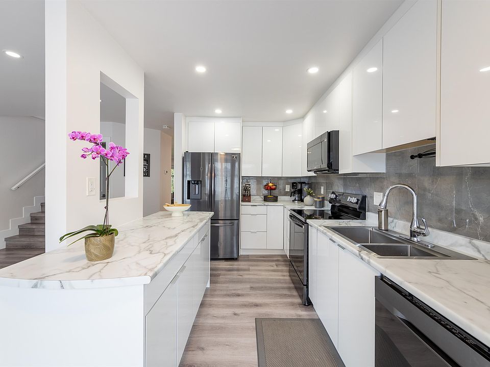 Rare find!!! Nearly 2,000 sq.ft. 3-level townhouse backing onto a tranquil greenbelt. The entry level opens to a fenced backyard and a large flex/rec room—ideal as a home office, gym, or 4th bedroom. Bright, airy main floor with a gas fireplace and a sunny sundeck facing trees for exceptional privacy. Fully renovated kitchen, refreshed bedrooms, and new light fixtures. Upstairs, the primary retreat offers dual sinks, a soaker tub, and a separate shower. $100K+ in upgrades: laminate flooring throughout; ~4-year-new appliances, furnace, and boiler. Ample in-home storage. Walk to Kennedy Trail Elementary; minutes to shopping, restaurants, theatres, and transit, with quick access to major routes. A refined blend of space, privacy, and convenience—Move-in Ready. Open House: Oct 11 & 12, 2–4 pm.