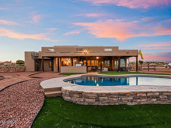 Kiva fireplaceResort-style pool with waterfallBuilt-in bbqRich architectural detailsRustic finishesLatilla ceilingsGranite countertops