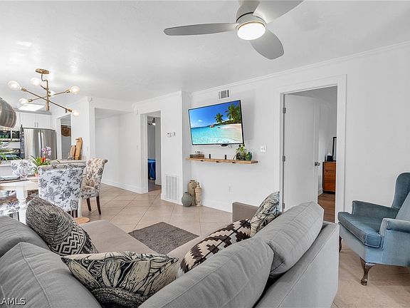 Hidden gem in the heart of South Fort Myers! Gorgeous updated 2 bedroom home with natural light and a beautiful green backyard view. Kitchen with new countertops, white shaker cabinetry, all new stainless appliances, and breakfast bar. Comfortable living and dining area opens to a cozy screened lanai looking out to the large and private backyard. Plenty of room for your plants! Primary bedroom boasts 2 spacious closets. Secondary bedroom is currently set up with both a guest bed and a large workspace - you will be impressed with how roomy and efficient this space feels! Light, bright and updated bathroom also features a jetted tub. AC 2017, hot water heater 2022, new roof 2023. Home can be sold furnished or not - buyer choice! This is one of only a few buildings in the community that carries flood insurance - included in your condo fee! Centrally located in Fort Myers just minutes from the beaches, restaurants, and shopping. Don't miss this one!