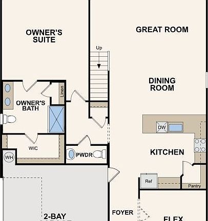 The Hudson plan at Averitt Landing presents a thoughtfully designed two-story layout with dual owner's suites, perfect for multi-generational living. The main floor includes a versatile flex room near the foyer, an open-concept great room that flows into the dining area, and a kitchen with a generous walk-in pantry. The main-level owner's suite features a spacious walk-in closet and an on-suite bathroom with dual sinks and a walk-in shower.