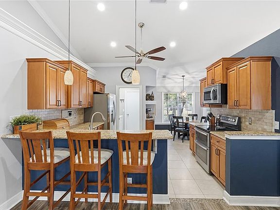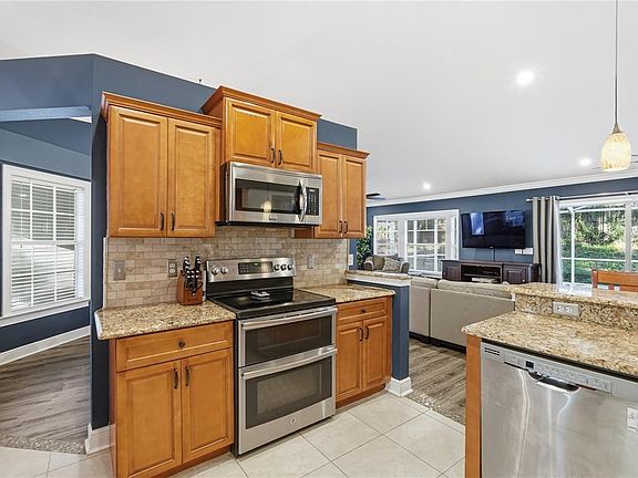 Welcome to this beautiful 3-bedroom, 2-bathroom pool home in the highly sought-after Deep Spring community of Palm Harbor. With a 2022 water heater, this home is perfect for Florida living. Step through the beveled glass front door into a bright, open floor plan featuring vaulted ceilings, crown molding, and wood-look tile floors throughout. The spacious living room boasts a large bay window overlooking the pool and lets in plenty of natural light, while the separate dining room offers the perfect setting for gatherings and special occasions. The modern kitchen is both stylish and functional, featuring granite countertops, stainless steel appliances, a breakfast bar, and a cozy dining area with a built-in coffee bar. The laundry room off the kitchen provides additional storage and convenience. This split floor plan allows you to relax in the primary suite with vaulted ceilings, a large walk-in closet, and an attached bathroom. The en-suite bathroom features a two-sink vanity, a garden tub, a glass-enclosed shower, and a private water closet. The additional bedrooms are nicely sized and share a full bathroom. Step outside to your private backyard oasis - a screened-in saltwater pool surrounded by a spacious deck, perfect for grilling, lounging, and dining outdoors. Beyond the screen enclosure, enjoy the fully fenced yard with a patio and fire pit area, ideal for cozy evenings under the stars. Additional highlights include a charming front porch to enjoy the Florida weather and a prime location close to top-rated schools, parks, shopping, dining, and just a short drive to the beautiful Gulf beaches. This Palm Harbor gem offers comfort, style, and the ultimate Florida lifestyle - schedule your showing today!