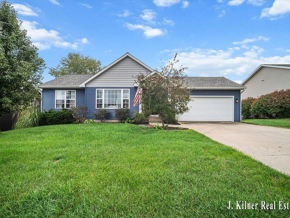 This 3 Bed, 2 Full Bath ranch in Middleville has everything you could want! It has a new roof (2023) new siding (2024) and new water heater (2024)! Upstairs has been tastefully decorated and painted, with many new fixtures. With vaulted ceilings, a spacious open layout and brand new carpeting, and a newly refinished deck it's absolutely turnkey! The 2 stall garage has a pull down walk-up for tons of storage as well! The lower level has recently been completely finished, with a beautiful full bath, large bedroom, huge rec room, work niche, and nicely sized laundry and storage area. It also walks out to the patio great for entertaining and relaxing!