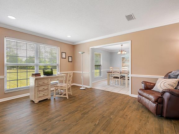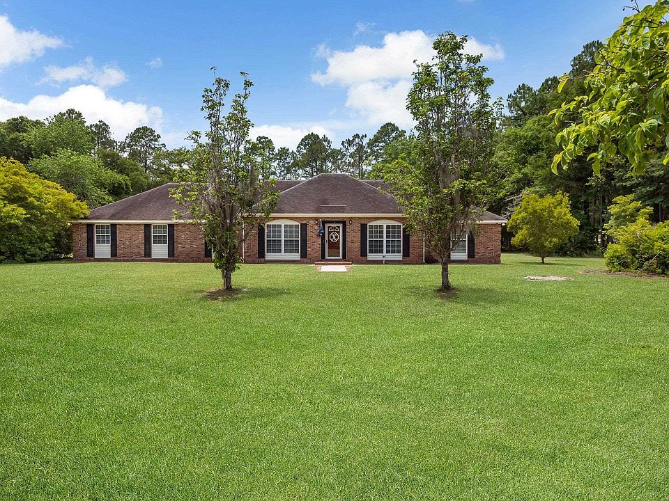 Beautiful brick home perfectly situated on a sprawling 3.82 acres. The home features over 2,500 heated/cooled square feet, 4 bedrooms and 3 full bathrooms. The foyer brings you in where you will find a formal living room, formal dining room and a large kitchen that overlooks the inviting family room, perfect for family time or entertaining. Cozy up to the brick-surround wood burning fire place. French doors off of this room lead you a concrete patio overlooking the backyard that is a great place to fire up the grill or simply enjoy the outdoors. Much of the home offers new LVP flooring & fresh paint while the remainder is tile flooring in great condition. The property itself allows for privacy from the main road, luscious grass, pecan trees, irrigation in place, shed & workshop, city water and ample space for kids, pets, additional outbuildings or your own garden. HVAC, including duct work was replaced in 2020.