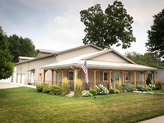 Back on the market. Located in the heart of Bluffton, this one of a kind 5-year-old barn dominium offers over 2,000 sq. ft. of finished living space and an attached 54x36 heated garage, spacious enough to store a camper play pickleball or keep all your 4 wheeled toys out of the weather. Situated on a double corner lot, it features a wrap-around covered front porch and a vinyl-fenced backyard hosting a charming patio with a firepit. The main floor's open concept seamlessly connects the kitchen, living, and dining areas. The kitchen includes all appliances, quartz countertops, tile backsplash and walk-in pantry making it an absolute show stopper. The first floor also includes one of two bedroom suites, and an additional bedroom both with walk-in closets, and a laundry room. Upstairs, you will find the second bedroom suite with a massive closet, tile shower, and access to a 10x19 loft with stairs leading to the garage. This home is exceptionally efficient, with all utilities averaging only $185 a month, even with the garage maintained at 50 degrees throughout winter. Envision your future here!