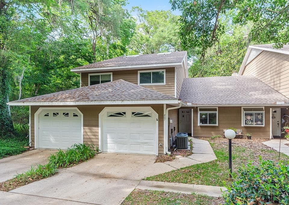 Adorable 3 BR, 2.5 BA attached home in SW planned unit development of Vintage View! This home boasts vaulted ceilings allowing tons of natural light and has had beautiful updates done throughout. The kitchen offers oak cabinets with a drop down desk area, pantry, bay "planter window" and a bar top seating area overlooking the great room. The dining area is open from there to the living area creating a nice flow for entertaining. The spacious living area also has nice views and access of the back deck featuring a Trex type decking and benches and a private wooded view. The ground floor also offers entry in from the one car garage, a half bathroom with laundry closet, a sitting/drop area under the skylight and the Primary Suite. The primary suite boasts the LVP flooring that spans the main living areas, flowing into a renovated vanity area and walk-in closet. Through the vanity/sink area is a separate renovated room with the glass shower and additional vanity. Upstairs are two large guest bedrooms, one with direct access to the full guest bathroom. Vintage View is in a superb location for convenience to UF/UF Health, North Florida, Oaks Mall, Butler Plaza, I75 and is on the bus line to UF! The community offers a pool, tennis court/b-ball court and community garden.