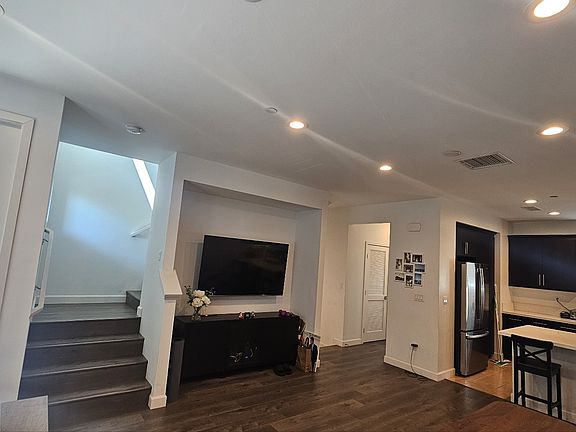 Welcome to this stunning modern luxury condo, built in 2016, featuring 2 bedrooms, 2.5 baths, and a versatile den on the entry level. The 2-car attached garage offers ample space for your vehicles and storage, complete with installed EV charging stations. This eco-friendly home is equipped with advanced solar panels (included and paid off!), an Energy Star-rated hybrid electric water heater, and a Nest thermostat, ensuring energy efficiency and sustainability. The rental includes a washer, dryer, refrigerator, and solar panel, making your move-in seamless. Upstairs, both bedrooms are designed for comfort, each boasting walk-in closets and private en-suite bathrooms. The entry level offers a large flex space, perfect for use as a third bedroom, home office, or additional living area. The entire house features wood flooring and recessed lighting. The open-concept kitchen and living areas are ideal for entertaining, and you'll find a convenient half bath and side-by-side laundry in the hall closet on this level. Rent includes all community amenities such as a swimming pool, spa, cabanas, and BBQs. You'll also enjoy access to a private dog park and a large community park with a playground and ample seating. Located within walking distance of The Source mall and just blocks away from Buena Park Downtown/Buena Park Mall, this home offers a prime location for shopping, dining, and entertainment. Enjoy quick access to the 91 and 5 freeways, and proximity to Knott's Berry Farm and Disneyland. Don't miss the opportunity to rent this exceptional home in the Parker Collection community!