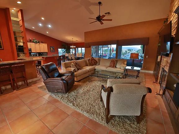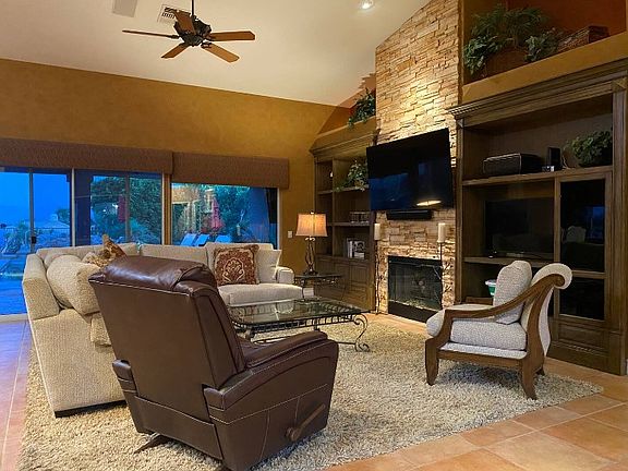 Come relax in a desert oasis that has been described as an insta gram worthy home. Former model home sits on the fairway of the Big Rock Golf Course at Indian Springs and is the perfect location to watch the sunrise over the mountains, read a book under the misters, relax and get cozy at the outdoor fireplace and cook up a feast in the well stocked kitchen. The lot is almost half an acre with lots of private space and located at the end of a cul de sac with parking for 6 cars.