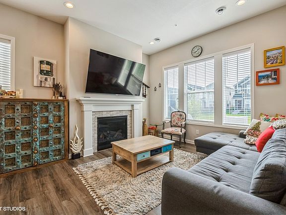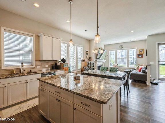 Open Concept Layout: The lower level features a spacious open concept kitchen, dining area, and family room, centered around a cozy fireplace.