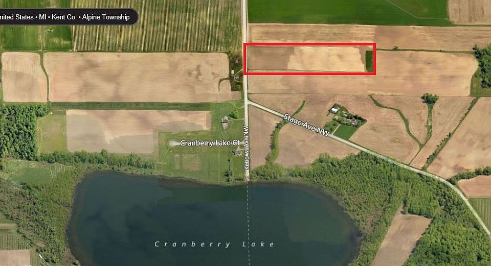 10.82 acres of rolling open land with beautiful views of Cranberry Lake! Successful county Vacant Land Evaluation performed and available upon request Alpine Township - low taxes Classified as Residential in an agricultural zone - currently leased as farmland - drain tile installed School District Number & Name: 41240 - SPARTA AREA SCHOOLS Parcel Number: 41-09-06-100-010 Land is near the intersection of Kenowa Ave. and Stage - Railroad ties upright marking 3 of the corners. Iron survey spikes in the ground at corners as well. Excellent farmland or development potential with beautiful elevated view of Cranberry lake. Multiple beautiful building sites which will accommodate a walkout or virtually any home design. Plenty of room for an outbuilding, horses, hobby farming, the sky is the limit. Build your dream home with a view and lease the remaining land for consistent income. No association fees or dues.