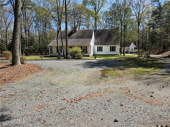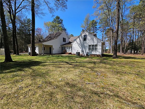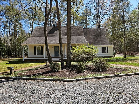 Welcome to this custom built Cape nestled on secluded 2.899 acres which awaits a new family eager to experience the solitude and beauty of this unique property while relaxing on the porch swing or entertaining friends and family in the large, private back yard. Close proximity to I-295, 64, 895, downtown and just a short drive to Williamsburg allows an easy commute in every direction. The enclosed foyer is just the beginning of hardwood floors, crown molding and chair rail running throughout much of the 1st floor. The Living room boasts floor to ceiling shelves for books, games, or to display your special treasures while the oversized Pella windows provide a beautiful view of the nature outside. The built in cabinets and illuminated glass shelves add a touch of elegance to the dining room. The kitchen was designed with efficiency and convenience in mind making preparation of meals a breeze. Enjoy the abundance of cabinets including pull out mixer shelf, multilevel quartz counters, lighted corner cabinet plus a huge pantry. The kitchen is open to a dining area and den with a panoramic view of the rear yard. Spacious first floor primary bedroom has private bath and huge, well designed walk in closet. Upstairs are two bedrooms, large bathroom, two double hallway closets and walk in attic. The garage is a dream come true! Two double drive thru doors with openers allow easy entry to the heated garage ready for you to utilize the abundance of shelves. Off the garage is a room which can be used as an additional living space or comfortable workshop. Don't miss seeing the large flex room upstairs which can be another bedroom, office, craft or play room. Built with energy efficiency as a priority, you will notice the wide window sills as the house was built to a higher quality design of double wall framing using an air gap to significantly improve the effectiveness of insulation and noise reduction. See listing attachment for more added features as there is just not enough room to mention it all! Don't miss out!