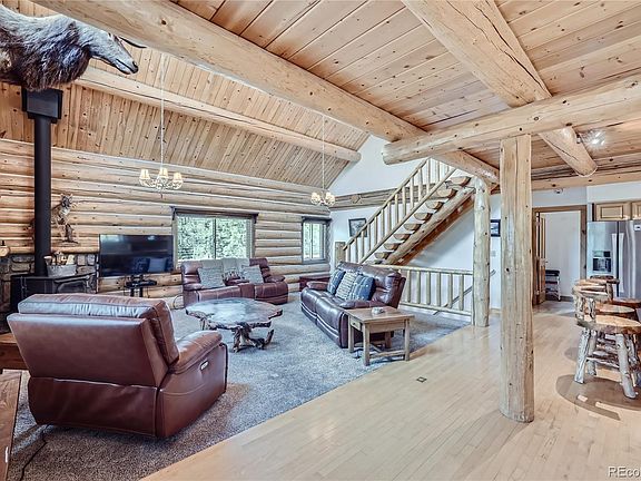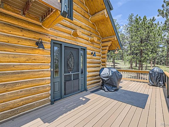 **Motivated seller** Welcome to your dream authentic Colorado log home, nestled in the tranquil and picturesque community of Mill Iron D Estates. Custom log construction utilizes handcrafted logs w/saddle-notch corners. Situated on nearly 4 acres of breathtaking land, this home offers an unparalleled blend of rustic charm, low maintenance & modern amenities. Main level features a beautiful, bright kitchen w/a large island, dining area, wood flooring, an expansive family rm w/soaring ceilings & abundant natural light, a wood-burning fireplace, & a bedrm w/ample closet space. Full bath & a laundry area w/an additional sink & storage cabinets. Upper level master bedrm w/a large closet a huge master bath & a spacious loft area w/a balcony overlooking the family rm. This loft currently accommodates a sauna, a home gym, an additional queen-size bed & an office desk & chair, making it a versatile space for work, relaxation & exercise. Fully finished walk-out basement is designed as a mother-in-law suite, complete w/an oversized bedrm that has a large walk-in closet, a bath w/ a shower, a laundry rm, living & dining spaces, easy-care tile floors, a ceiling fan & a full kitchen area complete w/a full fridge, stove, sink & microwave. Numerous windows allow for plenty of natural light & a newly installed gas heating fireplace & radon mitigation system ensure comfort & safety. Property also features a wrap-around low-maintenance Trex deck, a 28-jet spa w/a 7-seat capacity, a luxurious Sunlighten cedar programmable sauna for 3 & high-speed Starlink internet, w/2 gas/propane grills that stay w/ the property. Detached oversized 3-car garage that can fit 4 cars, garage door openers, a storage building & an RV electric hook-up on the premises. Lots of other parking spaces are available & a partially paved driveway. Stunning log home offers over 3400 sqft of living space, blending comfort and elegance in a secluded setting, perfect for those seeking a serene & comfortable lifestyle.