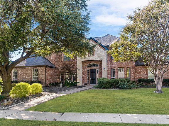 Welcome to this custom-built, original-owner home located in a second-to-none neighborhood within Stonebridge Ranch. Partial lake view with catch and release fishing only steps away. This elegant property offers timeless construction with 100% brick exterior, mature oak and crepe myrtle trees. The private backyard features a beautifully renovated foley diving and lap pool, size 38 x 18 x 10 ft. deep. View the serene backyard from the breakfast nook and patio. The home has a primary down and a second bedrm or office down with full bath next to it. 3 bedrooms up with LA. Two attached garages—a 2-car garage and a 1-car garage—provide exceptional storage and parking flexibility. Inside, the home underwent extensive updates, including full interior paint, new flooring throughout most of the rooms (hardwood, tile, and carpet), window blinds downstairs, and updated kitchen finishes such as leathered granite countertops, stainless steel appliances, shiplap island, backsplash, and hardware on all cabinetry. The primary bath was refreshed with new paint, faucets, toilets, and hardware. Additional features include two fireplaces (living room and primary bedroom), a wet bar off the living room, and a utility room plumbed for a sink with space for an additional refrigerator. Mechanical updates include two water heaters, roof in 2017, underground sprinkler system, downstairs HVAC replaced in 2012, and the upstairs HVAC replaced in 2015. Exterior improvements include fresh exterior paint in 2025 and solar landscape lighting. The pool was fully redone in 2024 with pebble, plaster, travertine, spa enhancements, $2,000 in LED lighting, stabilized skimmers, and an auto filler. Artificial boxwoods are placed outside the dining room window. Stonebridge Ranch offers unmatched amenities, including the Aquatic Center, sports courts, numerous playgrounds, lakes, greenbelts, and strong community appeal. This home delivers an exceptional blend of quality, privacy, location, and lifestyle.
