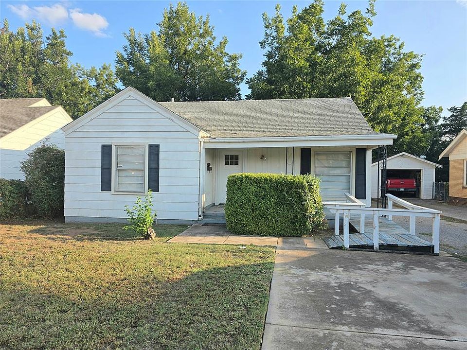 Large fenced backyardCovered front porchFresh paintDetached garageLarge drivewayMature treesRemodeled bathroom