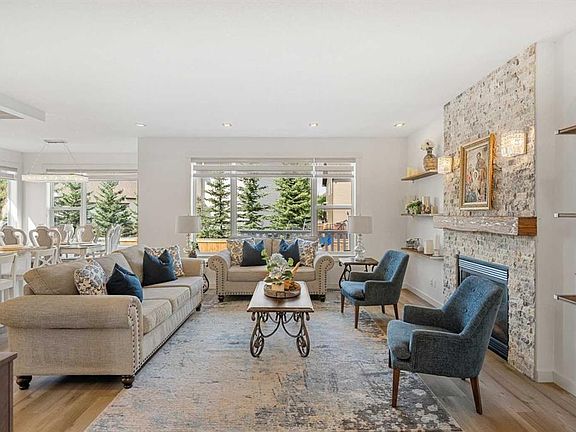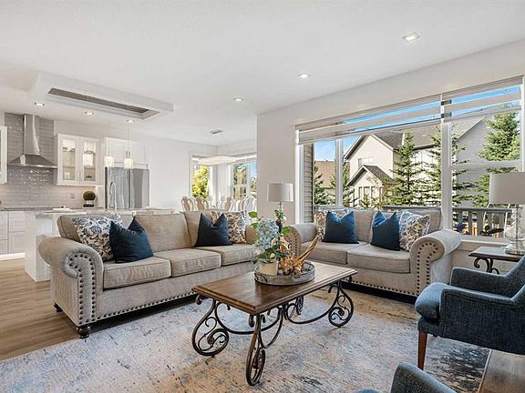 Nestled on one of the most sought-after streets in award-winning Cooper’s Crossing, this stunning home is designed to impress. Step inside and be greeted by a gorgeous, open foyer with soaring ceilings and a grand staircase as well as a versatile front flex room – perfect as a home office, playroom, or even a guest space that easily fits a queen-sized bed. Before you enter the main living area you find a fabulous and well situated guest bath perfectly tucked away. The living space dramatically opens with 9FT ceilings, wide vinyl plank flooring adjustable LED pot lights and chandeilers, and oversized windows with custom blinds, all allowing for plenty of light. The heart of the home is the fully renovated chef’s kitchen, featuring a built-in oven, microwave, and stovetop with a chimney hood fan, and elegant white cabinetry with glass panels and custom lighting – even inside the cabinets and along the toe-kicks for a dramatic evening glow. A fantastic walk-in pantry and functional mudroom with a deep freezer off the heated garage keeps everything organized and out of sight. The dining area comfortably seats eight, framed by picture windows with beautiful views of the backyard, while the living room invites you to gather around the striking floor-to-ceiling stone fireplace. Built-in shelving with power outlets flanks the fireplace, ready for your favorite décor or media setup. Upstairs has an air of sophistication with a lovely family room that overlooks the foyer – the perfect place for cozy movie nights. Architectural detail and arched doorways add a level of sophistication. The king-sized primary suite is a true retreat with its large windows, spa-like ensuite with maple cabinets, a soaker tub, walk-in glass shower, private water closet, and a sun-filled walk-in closet with its own window. Two additional well-sized bedrooms share a conveniently located main bath, and the laundry room – also with a window – is upstairs where you need it most. The unfinished basement is a blank canvas with plenty of space to create the basement of your dreams. Outside, the deck overlooks a large backyard – ideal for entertaining, gardening, or watching the kids play. The oversized heated garage boasts excellent storage, a new extra-tall garage door for trucks or vans, and there is LED exterior lighting for curb appeal and security. Living in Cooper’s Crossing means you’re part of Airdrie’s most celebrated community – voted Best Neighbourhood year after year – with its abundance of parks, playgrounds, pathways, and nearby schools. Add in the safe, welcoming atmosphere and this home truly has it all.
