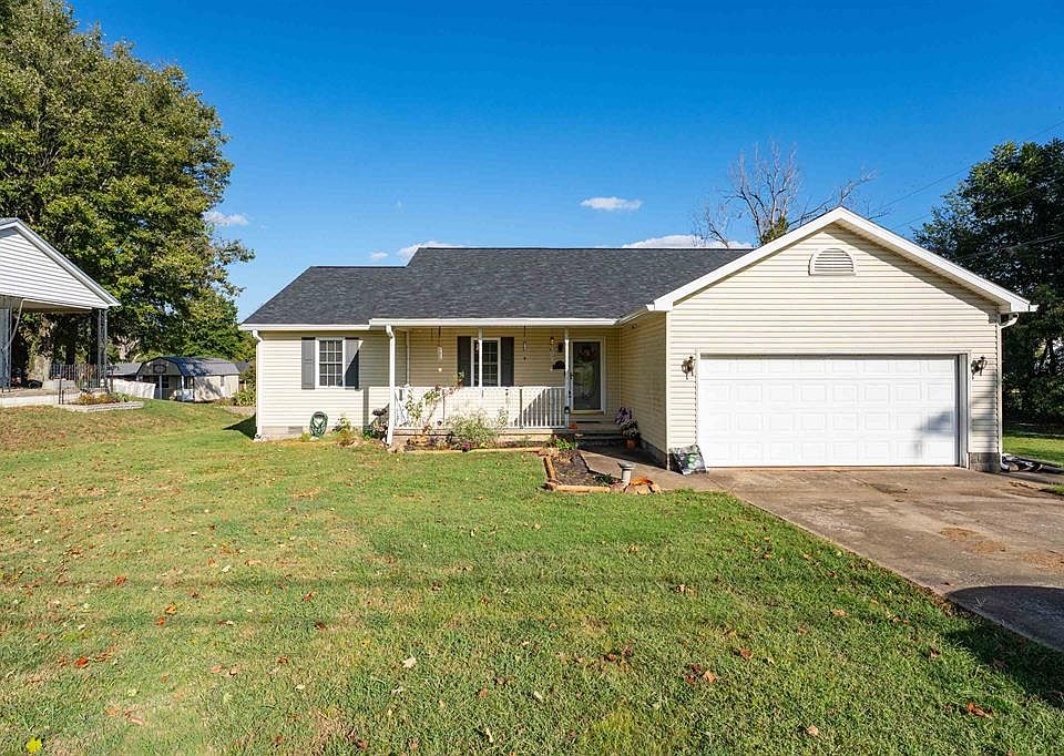3 bed, 2 bath home with 1,200 sq ft. Features a front porch, privacy fence, 2-car attached garage, and separate laundry area. Recent updates include HVAC in 2023 and roof in 2024. Sellers are offering a $5,000 flooring allowance.