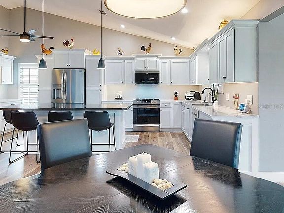 Amazing Lakefront Retreat in New Smyrna Beach Welcome to 808 Soft Pine Court, a beautifully upgraded 3-bedroom, 2-bath single-family home tucked away on a quiet cul-de-sac in the heart of New Smyrna Beach just four miles from the ocean! This serene lakefront retreat offers modern elegance, peaceful surroundings, and the perfect blend of indoor-outdoor living. Step inside to find soaring ceilings, 100% waterproof luxury vinyl plank flooring, and custom craftsman-style finishes throughout. Plantation shutters, integrated LED lighting, and remote-controlled ceiling fans enhance the polished coastal feel. The open layout offers flexibility, with the third bedroom currently used as an office or flex space. The showpiece kitchen was fully remodeled with both design and functionality in mind. It features crisp white shaker cabinetry with pull-out shelving, quartz countertops, and a striking 8x4 bamboo island that anchors the space. Enjoy a dedicated dry bar and premium stainless-steel appliances, including a Bosch dishwasher, Frigidaire Gallery oven with built-in air fryer, microwave, and a four-door refrigerator. Under- and over-cabinet LED lighting adds a sophisticated glow, creating a perfect environment for cooking and entertaining. From the main living areas and primary suite, take in breathtaking lake views through upgraded hurricane-impact windows and sliders. Step out to the screened lanai—built with reinforced screening and accessed through its own sliders—ideal for morning coffee or evening relaxation. Beyond the lanai, a large pergola with a new sun sail and string lighting extends your living space outdoors, perfect for gatherings under Florida’s colorful sunsets. Additional highlights include a Generac whole-home generator, finished garage with rubber flooring and attic access, Samsung washer/dryer, 2025 smart thermostat, full irrigation system, landscape lighting, and an attached storage shed. Located in a peaceful, family-friendly community offering a sparkling pool, this home combines tranquility with convenience—just minutes from the beach, shopping, dining, and entertainment. Whether you’re searching for a full-time residence or a vacation getaway, this move-in-ready lakefront gem invites you to experience the best of Florida coastal living.