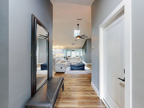Step inside and you’ll immediately notice the high ceilings, 100% waterproof luxury vinyl plank flooring, and upgraded craftsman-style finishes throughout. Plantation shutters, integrated LED lighting, and remote-controlled ceiling fans give the home a polished, coastal feel. The flexible floor plan offers three bedrooms, with the third currently being used as an office/flex room.