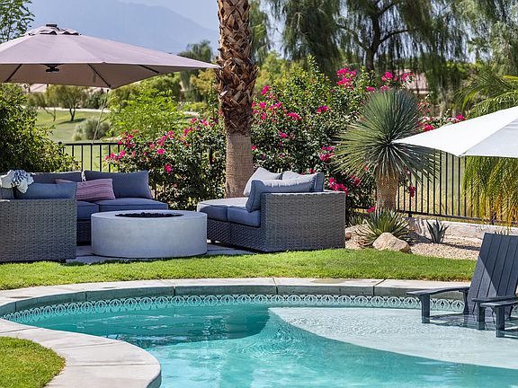 Ultimate desert resort style living. Located in guard gated Sun City Shadow Hills featuring the highly desirable San Rafael floor plan and adjacent to an open area on one side of property for more privacy. This totally remodeled home includes resort like pool with spa, 3 spacious bedrooms plus a den for a possible 4th bedroom and 2.5 bathrooms. The entry leads to a large great room with picture windows & sliding door to the entertainer's yard and is adjacent to the gourmet kitchen! Featuring quartzite countertops, white cabinets, all stainless steel appliances, built-in combination wall and microwave oven, refrigerator, and 5-burner gas cook top. LG steam washer & dryer in the laundry room with plenty of cabinet space & sink that leads to a 3 car garage with included golf cart. The beautiful master suite has sliding doors to the back yard with views of the pool and golf course, a large bathroom with freestanding soaking tub and separate shower and a large walk-in closet. Master has total privacy as the 2 guest suites are on the opposite side of the home and they share a Jack and Jill bath with walk-in shower. Experience outdoor living at its finest with a pool featuring a tanning shelf and an 8-foot spa. Entertain effortlessly with a built-in stainless steel BBQ and gather around the inviting gas fire pit, surrounded by a cozy, comfortable couch.