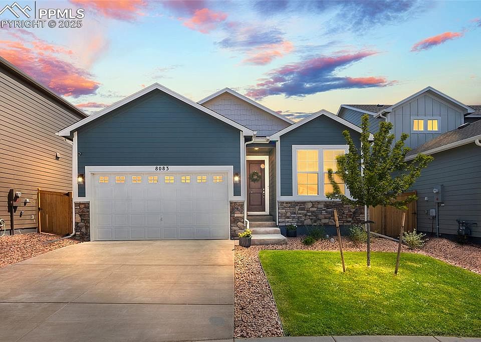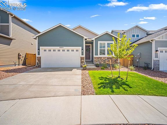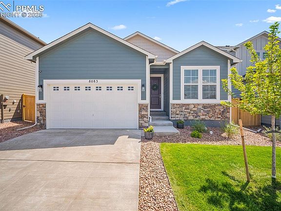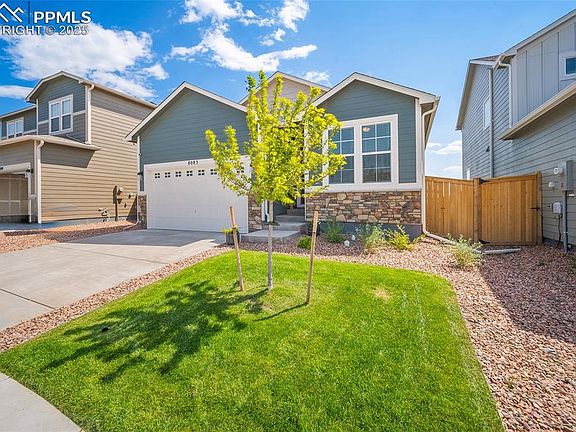 Tucked in a quiet cul-de-sac, this nearly brand-new ranch home backs to open green space, Sand Creek, and offers partial mountain views. The spacious floor plan features three bedrooms on the main level, including a private primary suite with an ensuite bath and dual vanities. The heart of the home is the chef’s kitchen, complete with a quartz island that seats four, upgraded gourmet pantry with hidden prep space, and abundant storage. The open-concept dining and living areas flow seamlessly to a covered patio deck, perfect for enjoying Colorado summer evenings. Downstairs, you’ll find an additional bedroom and full bath along with a massive rec area—ideal for movie nights or even a kids’ playroom. A large unfinished storage room offers flexibility to add a home gym or finish out for even more living space. Located in the desirable Aspen Meadows community, residents enjoy convenient access to Marksheffel and Woodmen Rd, plus a brand-new playground, nearby restaurants, and grocery shopping. With low HOA fees and lower tax rates than comparable master-planned communities, this home combines comfort, location, and value.