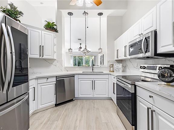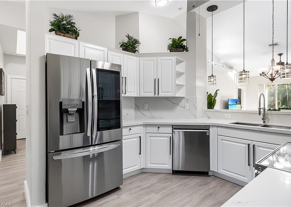 NEW A/C installed in September ‘24! WATER, CABLE, ROOF covered by association! Motivated Seller, Furnishings Negotiable *Income Producing Property* - Welcome to this beautifully remodelled 3-bedroom, 2-bathroom villa. Featuring luxury vinyl flooring throughout—with no carpet in sight—this villa offers over 1,660 square feet of open and airy living space with plenty of natural light. Upgraded stainless steel appliances, premium quartz counter tops throughout, white-shaker cabinetry and volume ceilings for the perfect open-concept feel. Master bedroom includes a spacious shower and separate soaking tub, his and hers sinks and walk-in closets with great storage space. Unwind on your private patio with serene lake views and a screened-in lanai. Full 2-car garage with wall-to-wall storage units and laundry tub! Enjoy amenities such a resort-style pool, fitness room, walking/biking paths, tennis court or simply explore the nearby shopping, dining, and entertainment options. Just 11 minutes away from downtown Naples and its world-renowned white sandy beaches, 6 minutes to I-75 and minutes to local grocery stores, shopping plazas and several restaurants, this villa offers a slice of paradise in an unbeatable location!!
