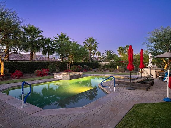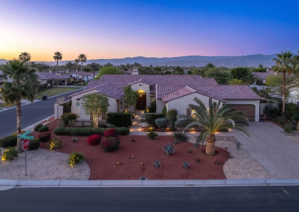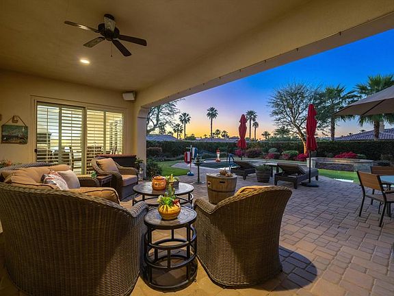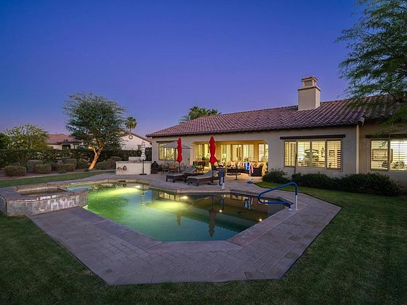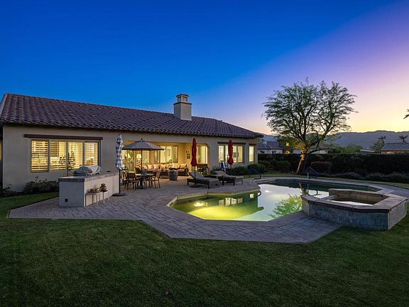 Gated Stonefield Estates is a small enclave of quality built homes on estate sized lots, situated in a prime location, off Madison, just north of AVE 50, within walking distance to the polo fields, Stagecoach and Coachella Fest. This former model home is on a corner lot and boasts a 22,000+ square foot beautifully landscaped lot with grassy yard, pool/raised spa, built in BBQ, and covered paver patio designed for entertaining. Large gourmet kitchen has Wolf range with double ovens, 6 gas burners and griddle and Wolf hood. Subzero refrigerator, Asko dishwasher and Wolf microwave round out the appliance package. Friends and family will gather around the island breakfast bar, dining area in the kitchen and adjoining beamed ceiling great room with fireplace and sliding doors to backyard. There is a large formal dining room adjacent to the kitchen as well. Primary bedroom has bath with dual vanities, separate tub and shower, and walk in closet. Bedrooms two and three share a Jack and Jill bath with shower over tub. HUGE casita currently configured with dining table/hutch at one end, would work well with couch/chairs and TV at the end. Casita bath has walk in shower. Powder room, laundry room and attached 3 car garage round out the floor plan. Monthly HOA of $405 covers common area maintenance within the community, streets and gate. Furnishings very negotiable.