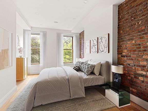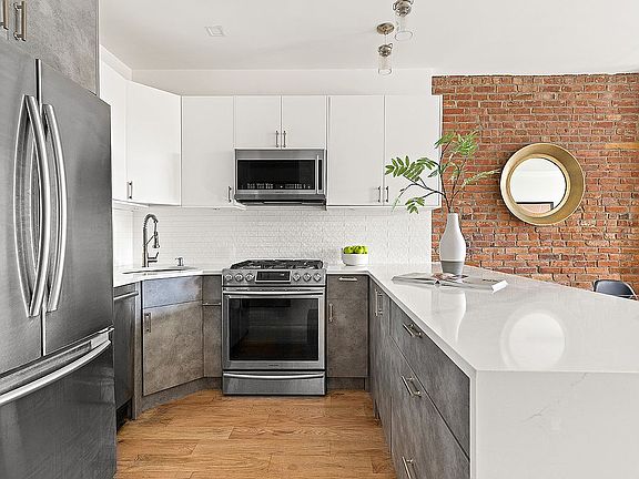 This 1,129-square-foot three-bedroom, two-bath residence pairs modern design with the warmth of Brooklyn brownstone living. The open and airy living/dining room welcomes you with natural light and abundant space for both intimate nights in and large-scale entertaining. The thoughtfully designed U-shaped kitchen anchors the space, featuring custom cabinetry, sleek stone counters, and a suite of high-end appliances that make cooking and gathering seamless.