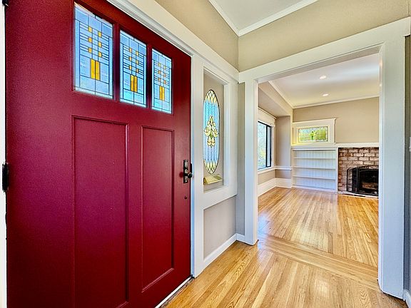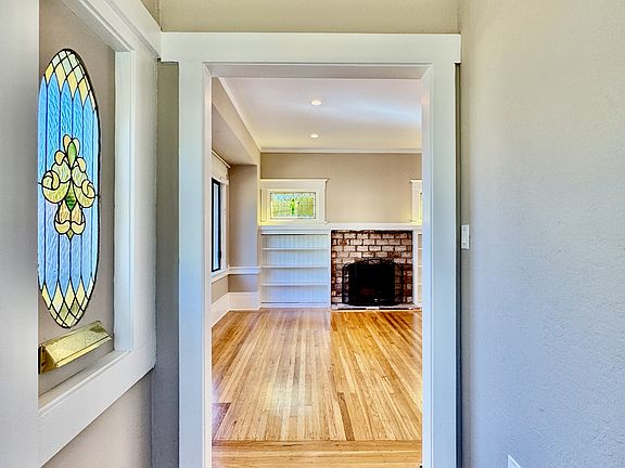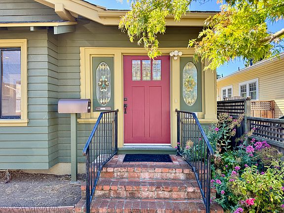 Welcome to this updated, charming retreat located close to Burlingame Avenue! Filled with timeless period detail juxtaposed with contemporary flair, this single story home radiates lush and bold colors to relax and invigorate the soul. Gleaming oak hardwood floors paired with recessed lighting and a large picturesque window flood light into the spacious living room encompassed by built-in shelving, a fireplace, and beautiful stained glass windows. Continue through the formal dining room with board and batten wood treatment, mini-split for heating and cooling preference, built-in cabinetry, polished off with a Tiffany-style chandelier.