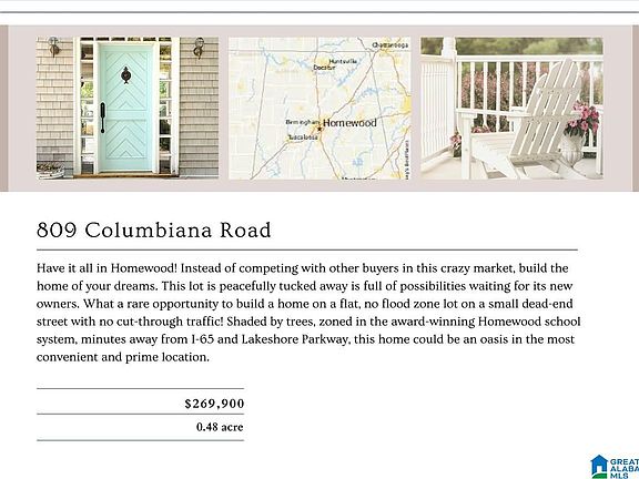 Have it all in HOMEWOOD! This lot peacefully tucked away in Homewood is full of possibilities. What a RARE opportunity to build the HOME OF YOUR DREAMS on a FLAT, NO FLOOD ZONE lot on a small dead end street with NO CUT THROUGH TRAFFIC! Take a 6 MINUTE stroll and grab dinner at the very popular Italian restaurant Gianmarcos. Zoned HOMEWOOD SCHOOL SYSTEM, minutes away from I-65 and Lakeshore Parkway, this home could be an oasis in the most CONVENIENT PRIME location.