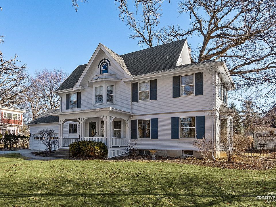 Opportunities like this do not come around too often! Located in Elgin's most sought after "Gold Coast" neighborhood on beautiful tree lined street! This farmhouse style home stands out on a gorgeous oversized level lot! Covered front porch perfect for summer nights! Step thru the front door and the character and charm begins! Large foyer/parlor area with crown molding and gleaming hardwood floors! Bright and very open living room with custom fireplace, crown molding and bay with picture window! Convenient front office with crown and rich wood paneling! Adorable kitchen with breakfast bar, upgraded stainless steel appliances, granite countertops and T&G ceiling leads to the separate dining area with solid brick fireplace, custom built-ins and French doors leading to your dream screened porch with awesome views and door to the side brick patio! Oversized laundry area with extra cabinets and exposed brick wall! Beautiful solid wood staircase leads to the large 2nd floor landing! Spacious master suite with triple closets, crown molding and private bath with custom dual sink vanity, walk-in glass shower and custom tile work! Upgraded hall bath! Adorable secondary bedrooms with built-ins, bay area and plenty of room! Walk-up attic for extra storage! Very functional basement perfect for rec room, crafts and exercise area! So many possibilities! The yard is absolutely gorgeous with mature trees and perennials thru out! This is a forever home! Quick access to I-90, train and downtown!
