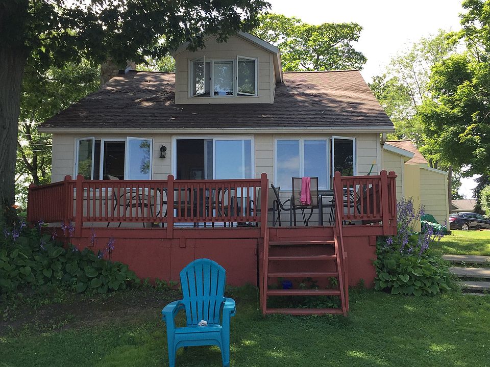 A great opportunity to own a quintessential lakeside cottage with amazing views of Cayuga Lake.The charm of a by-gone era,original tongue & groove wainscot walls in the living/dining area with a beautiful fieldstone fireplace to enjoy chilly fall evenings.Enclosed lakeside porch can sleep additional family and guest,has large windows and sliding glass doors leading out to deck. Fully applianced kitchen,1st flr laundry w/stackables.Upstairs has 3 bedrooms and a sitting area.Many upgrades include new architectural roof, dock and boat hoist. Peaceful community/leased land.Owner financing possible