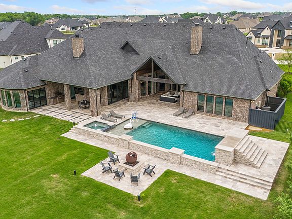 This custom-built home is situated on a rare 3.1-acre private, tree-lined lot in the highly sought-after Lovejoy ISD. A refined blend of luxury, design, and serenity, from the moment you step through the custom Mahogany pivot door, you’re greeted by a light-filled, open floor plan, soaring ceilings, and rich hardwood floors that flow throughout. This thoughtfully designed home offers 6 spacious bedrooms, 5 full and 2 half baths, including 4 ensuite bedrooms, ensuring comfort and privacy for all. The chef’s kitchen is a true showstopper, featuring dual oversized islands, granite and quartzite countertops, Blanco sinks, and a tucked-away prep kitchen—ideal for effortless entertaining. Enjoy casual and formal gatherings alike in the expansive living room, highlighted by a bold 49” wood-burning fireplace and a stunning cold rolled steel feature wall. The game room, media room, and wet bar provide ample space for recreation and relaxation. The luxurious primary suite offers a peaceful retreat with a groin ceiling, arched windows, automated shades, and backyard views. The spa-inspired primary bath boasts heated floors, a rain shower with six body sprays, and a 72-inch soaking tub, with dual custom closets—hers with direct access to the laundry room that doubles as a reinforced storm shelter. Step outside into a private outdoor paradise, complete with travertine decking, a built-in kitchen, resort-style pool and spa, and a firepit with custom fire sphere. Surrounded by professional landscaping and ambient lighting, the outdoor space is perfect for year-round enjoyment. Additional features include a 4-car garage with epoxy floors and dedicated RV bay, Tesla charger, whole-house generator, water softener, integrated smart home AV system, and surround sound.