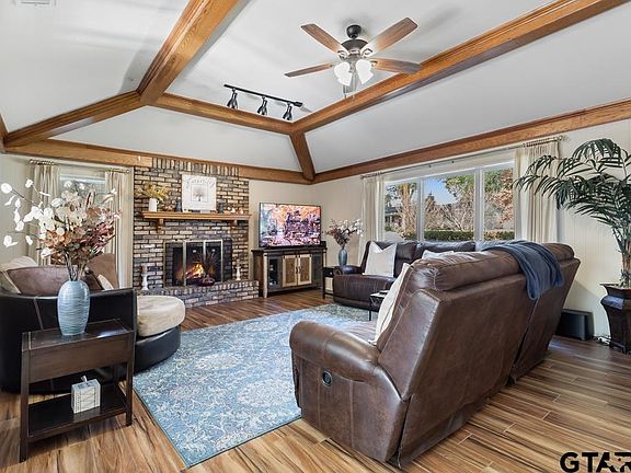 This one is a gem! Great location, great condition. This lovely three bedroom, two bath, two car garage home on Jeffery Drive in Tyler is super clean and well maintained. The welcoming front porch leads you into the living room with double raised ceiling with beams, brick gas log fireplace, wood-look tile flooring, and windows facing the front. Kitchen and breakfast room are off the living room with lots of room for your big table and chairs. Kitchen has granite-look laminate countertops, pretty back splash, electric cooktop, wall oven, pantry cabinet, breakfast bar, dishwasher, built-in microwave, and a sink with window overlooking the back yard. Utility room is off the kitchen and leads to the spacious two-car garage. Three bedrooms and two full baths are all on one hallway. All are nice-sizes with plenty of storage. Primary bedroom has two walk-in closets and ensuite bath. Back patio is perfect for entertaining or just birdwatching. Back neighbor has large property so you almost feel like you are in the country in the middle of town. Pretty landscape offers a serene feel in the back yard, and such a great view. Partially fenced. This is a very nice home that has been loved by it's owners. See for yourself!