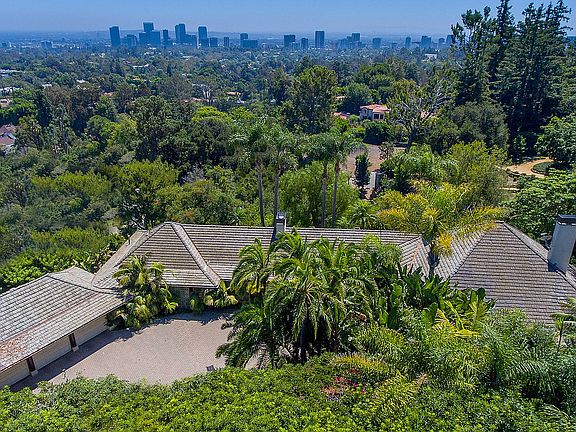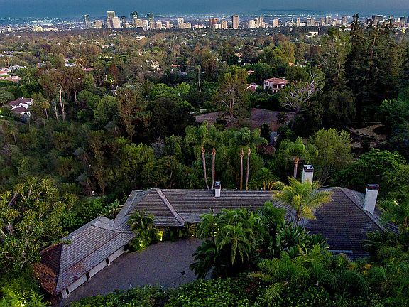 This extraordinary Balinese-inspired estate is situated on apx. 1.43 acres in prime Lower Bel Air. Perched on a promontory overlooking panoramic city views, this property offers a secluded & tranquil resort-style setting. Private gates lead down a long private driveway to a large motorcourt & 3-car garage. The double-doored entry is flanked by a lush lily pond. The formal foyer leads into the magnificent great room. Arranged in an open floor plan under a main pavilion w/soaring ceiling & an intricately-designed structure of beams, the great room combines the living rm, family rm, den, & formal dining rm. Walls of glass throughout open to the lush exterior & welcome the shimmering city views. Large chef's kitchen w/professional appliances & over-sized butcher block island. The master suite is spacious yet intimate, w/seating area, fireplace & spa-like bathroom. Three additional bedrooms. The private & verdant grounds are complete with lawn, pool, fountains, & meandering paths.