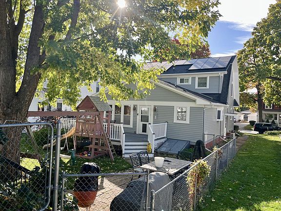 Located in the Richards Hill Historic District near schools and parks, this charming home blends historic character with modern updates. The foyer welcomes you with an open staircase and French doors leading to a beautiful living/dining room with original woodwork and hardwood floors. The updated eat-in kitchen features vaulted ceilings, great natural light, and plenty of cabinetry. A main floor addition offers a full bath and spacious family room. Upstairs, the primary bedroom includes a newer walk-in closet with custom built-ins. Enjoy updated radiant heat, two mini-splits, a whole-house fan, energy-saving solar panels, a large deck, fenced yard, and an oversized insulated 3-car garage.