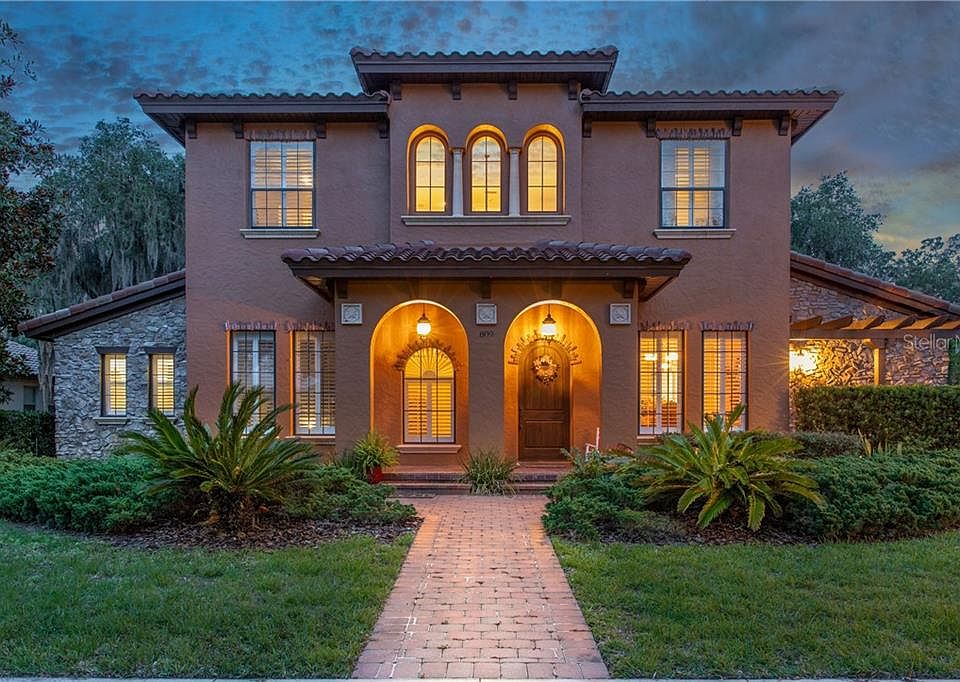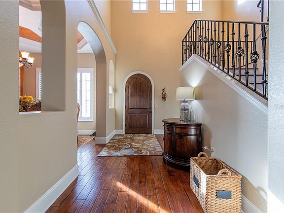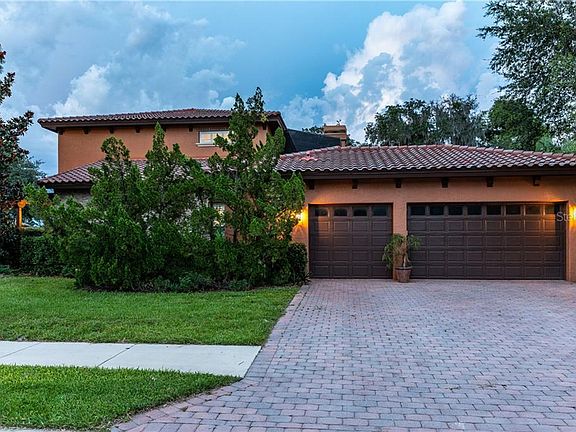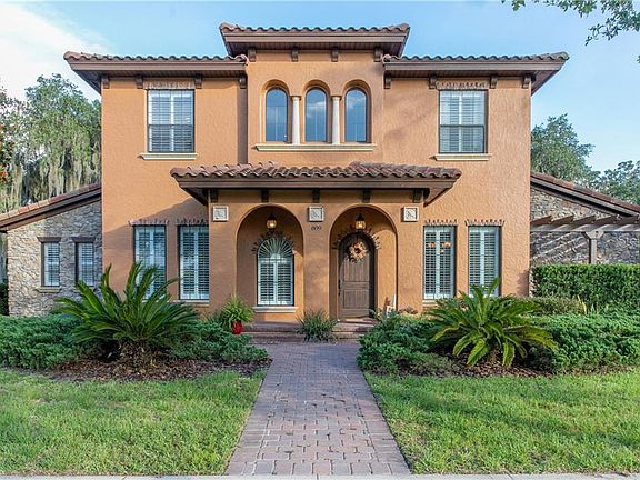 Gorgeous, custom, Mediterranean style home in the very desirable community of Riviera Bella. This home features 5 spacious bedrooms, an office, wine cellar (with an arched rod iron door), outside kitchen, mud room and butler pantry. 2 fireplaces (one inside and one outside), plantation shutters throughout the interior of the home. Huge slider doors overlooking the breathtaking pool area with heated spa. Wood floors throughout the living area and kitchen. The kitchen features 2 copper sinks (one in the large island), granite countertops, beautiful backsplash, gas stove, along with a wine refrigerator. This house is absolutely perfect for entertaining, with too many upgrades and extras to list. The house is situated on a premium, oversized corner lot & close to boat ramp for River access. The gated community offers a club house with community pool, splash pad, media and fitness rooms and playground. Riviera Bella is a 10-min. drive from I-4 and 4 miles to the Sunrail. Schedule your private showing today. This property may be under audio/visual surveillance.