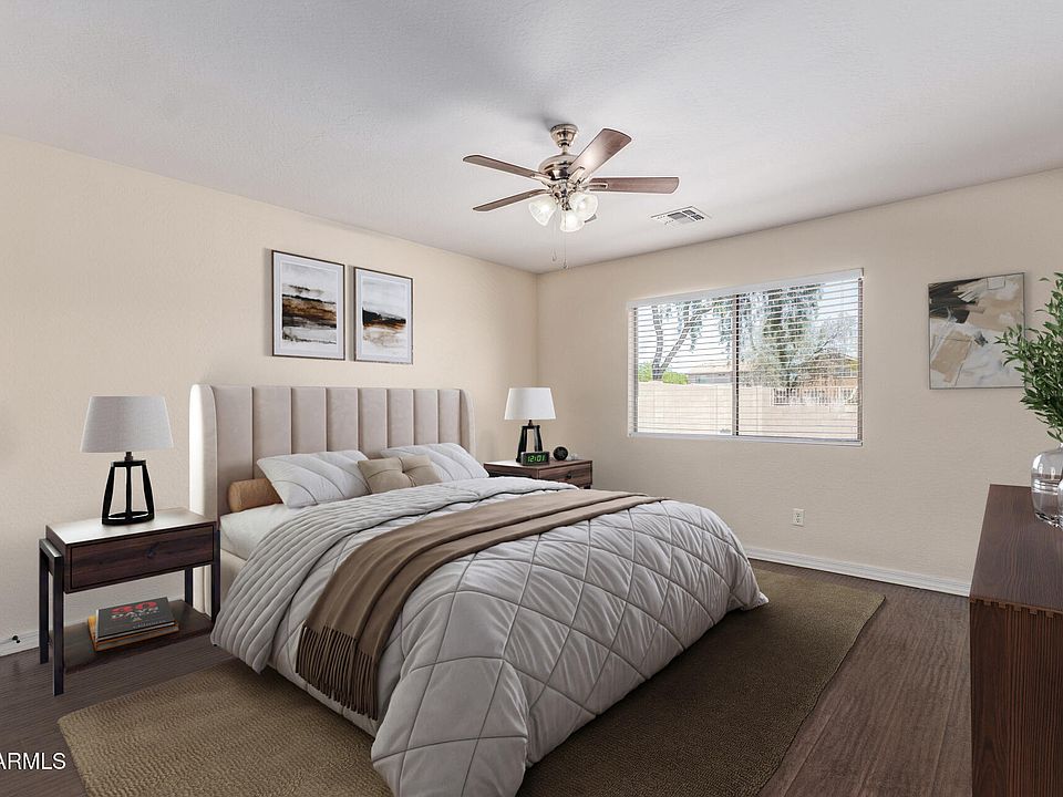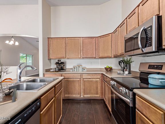 This gorgeous, move-in ready 4-bedroom home with wood flooring throughout......that's right, NO carpet, is meticulously maintained and offers plenty of space with a dining room, family room, and eat-in kitchen. Brand new stove, microwave and dishwasher were just installed. The NEST thermostat adds comfort and energy savings. This home is low maintenance with the beautifully landscaped front and back yard. The property also has a sprinkler system which offers additional piece of mind. The view fence overlooks a community greenbelt and walking path, providing peaceful, open views. The community features a ramada, BBQ area, and playground for outdoor fun. Don't miss out on this incredible home!