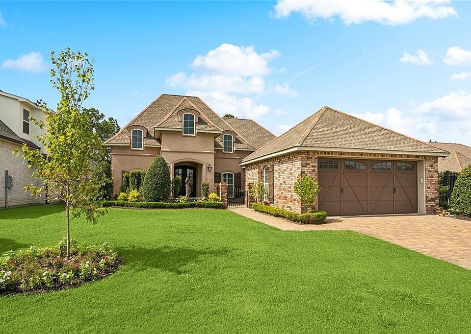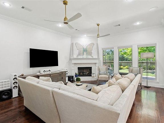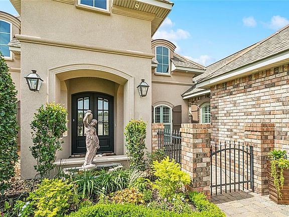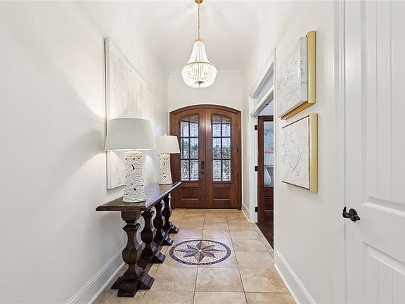 This stunning 4 bedroom, 2.5 bath home is located in gated Maison du Lac subdivision. As you enter through the courtyard into the foyer with travertine flooring, you are greeted by the beautiful architectural details and updates throughout the home. The professionally designed interior by award-winning Bmac Interiors blends timeless style with modern function. The living room features a corner gas fireplace and an arched opening that leads to the kitchen and dining room, perfect for entertaining guests. The primary suite is spacious with a double tray ceiling and a luxurious ensuite bathroom with a double vanity, jetted soaker tub, tile shower and a custom closet with direct access to the laundry room. Outside, the large rear patio includes an outdoor kitchen and beautifully landscaped yard that backs to wooded greenspace. Enjoy built-in Paradigm surround sound in the living room and pre-wired outdoor speakers for seamless entertaining, indoors and out. This home is truly a retreat from the hustle and bustle of everyday life, offering a peaceful and serene setting for relaxation and enjoyment.