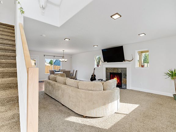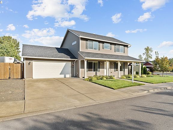 Welcome to this inviting 2 story property in Molalla! This 3 bedroom, 2 and a Half bath property offers a seamless open-concept layout that connects the kitchen, dining, and living area. The kitchen boasts sleek stainless steel appliances, wooden cabinetry, and plenty of natural light. The dining area flows into a cozy living room with a fireplace and large windows, creating a bright and welcoming space. The office is located on the main level and is positioned between the kitchen and living room, offering seamless access to both areas through adjacent doorways. Upstairs, you'll find three spacious bedrooms, including a primary suite that features a large walk-in closet and a private bathroom for your ultimate comfort and convenience. This property comes with the perfect perk—convenient RV parking right on the property, making it easy to embark on your next adventure at a moment's notice! This charming yard offers a delightful blend of features: a practical shed for storage, a beautifully maintained grassy area for relaxation, and a gravel side yard with a raised garden bed—ideal for gardening and outdoor enjoyment.