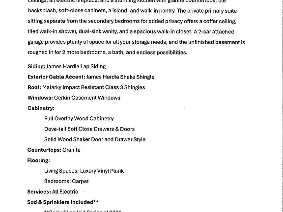 NEW CONSTRUCTION Featuring open floor plan with heat pump, electric fireplace, granite countertops in the stunning kitchen. Soft close cabinets, tile back splash and walk in pantry. 3 BR, 2BATH featuring a primary suite with tiled walk-in shower, double vanity and a coffered ceiling. Luxury vinyl plank flooring in living spaces, carpet in bedrooms. Covered patio to relax on and sod with underground sprinklers included.