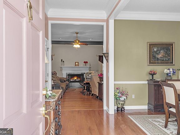 Located on a large corner lot in Hunter's Point Subdivision this home is designed for comfortable living. Entering the front door the wide entry foyer leads to the formal dining room with plenty of space for family gatherings. From there the large great room invites you to sit by the wood burning fireplace or snuggle in a big chair to watch TV from the beautiful built in book case area. Doors from the great room lead to a covered patio and private back yard. From the Great room or formal dining, you can access the oversized kitchen featuring the island with cook top, eat in breakfast area/ keeping room large windows also let in plenty of light. Two pantry closets and an oversized laundry room is also down hall from kitchen. On the bedroom side, the Primary bedroom is oversized, and the primary bathroom has been updated with tile shower and a built-in permanent bench to sit and get dressed or put shoes on. The garage has a wall of built in cabinets with drawers and plenty of space for tools and working on crafts. Another storage room in garage houses the hot water heater, and a mud tub. Well maintained and great location.