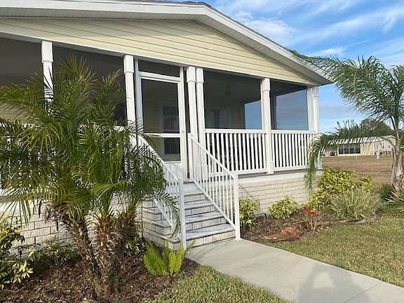 NEWLY LISTED ALMOST NEW 2020 HOME IN THE RESERVE AT GRAND VALLEY This home on Rocky Road sits at the entrance to the reserve at Grand Valley. This home features a full width screened in front porch located on the retention pond where you can enjoy cool summer evenings by the water, listening to the birds and sipping a cocktail and talking to your neighbors as they pass by. This porch has two ceiling fans and full screens to complete the Florida lifestyle. Entering the home you will notice in the living room on the right an enormous trey ceiling which houses a ceiling fan which looks like its large enough to be a propeller on a navy destroyer. On the left side as you enter is the dining room, from there you go into a kitchen that is a cooks delight, which features an eat in bar. The kitchen features modern appliances with a large stainless steel farm sink. Moving down the hall way on your right you will encounter a set of gorgeous french doors leading into a large den/office/ or extra bedroom. The choice is yours. Opposite the French doors a short hall way which features the washer and dryer, leads to an exterior door and a large one car garage, where you will find lots of storage room with extra shelves for your convenience. ` The extra long concrete driveway can accommodate multiple vehicles. Coming back in to the house you will find a beautiful guest bathroom, continuing on down the hall through the rear of the home you will encounter an enormous master bedroom with a fabulous ensuite bathroom. Everything in this home reeks of custom amenities, far to many to list in this description. You will see many, many things in this custom built home that you will not find in any other in the park. This home sits on a corner lot, next to a retention pond (water front property). The home is in a 55+ community where you can enjoy peaceful and serene living. The lot rent is $390 which includes twice weekly garbage pick up, weekly recycling and your lawn care. Mail is delivered to the end of your driveway. The many amenities of Grand Valley are available to the home owner such as heated swimming pool, shuffle board, dinners, dances, card games and many other activities. This home is custom through and through and the only way to fully appreciate what is being offered for only $325,000 is to come and see for your self.. Call Frank for a showing. I am sure you will not be disappointed.